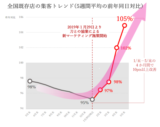 協業開始から4ヶ月後には10pts.を超える既存店客数の成長まで改善。丸亀製麺のV字回復の第一歩を踏み出しました。