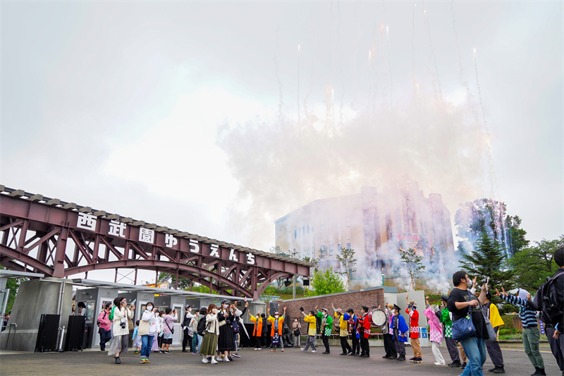 午前9時、新しい「西武園ゆうえんち」のエントランスで、開門を今か今かと心待ちにしているゲストの皆さまを巻き込んで、巡査、魚屋、八百屋など、おせっかいなほど人情味あふれる商店街の住人たち(エンターテイナー)とフレンズクルー(スタッフ)が、一緒にオープンへのカウントダウンを開始しました。オープンの瞬間には、華やかなパイロ(演出用花火)が空を彩り、ゲストは手にしたグランドオープン記念の旗を振って、新しいのに懐かしい非日常の世界へ入場。記念すべきグランドオープンを一緒にお祝いしました。